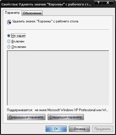 В появившемся окне, переходим: «Конфигурация пользователя» — «Административный шаблоны» — «Рабочий стол». Ищем ярлык «Удалить значок корзины с рабочего стола» и нажимаем по нему правой кнопкой мыши: выбираем пункт «Свойства»