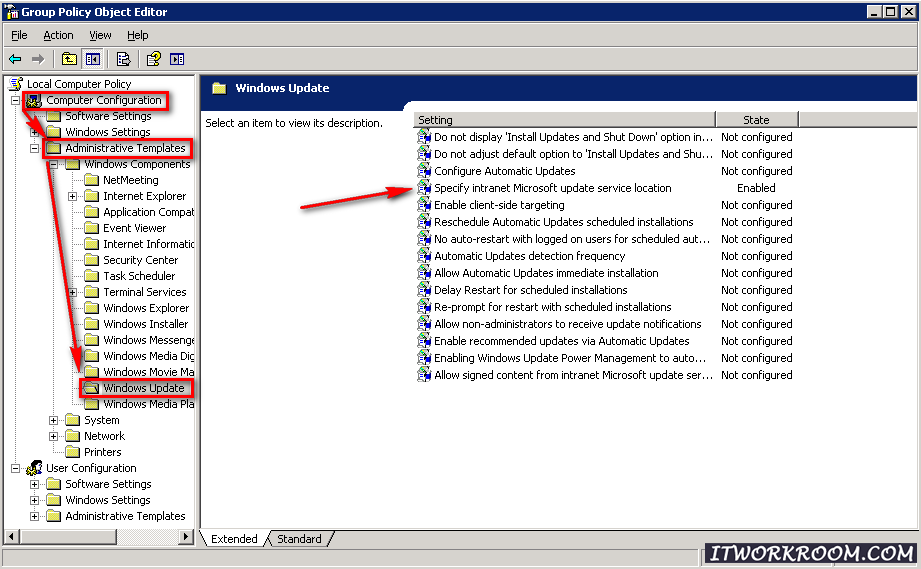 Перейти: Computer Configuration (Конфигурация компьютера) — Administrative Templates (Административные шаблоны) — Windows Update (Обновления Windows) — Specify intranet Microsoft update services location (Специфическое месторасположение сервисов обновления Microsoft).